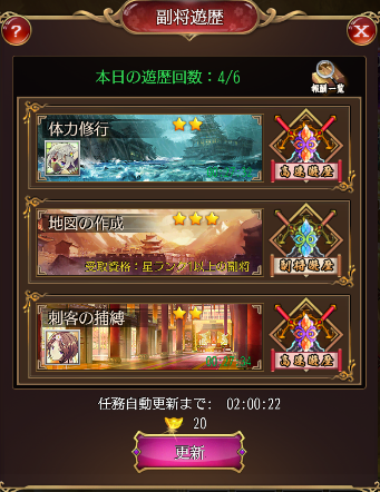 - 元宝を消費して、遊歴更新すると星レベル4以上のステージが出て来るようになります。最大星レベル10まです。
