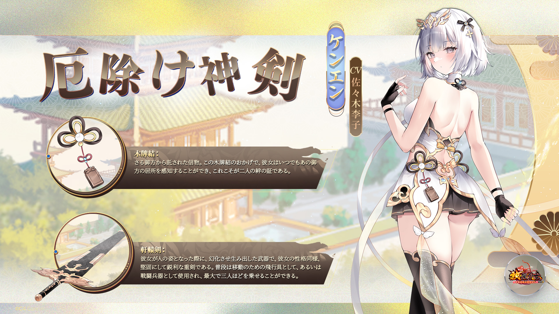 古の神器「軒轅剣」の剣霊、普段は剣の中に宿っていて、十分な力を蓄えた時、主人の呼びかけに応じ、いつでも人の姿に変化することができる。主人の神・劉備の側近護衛として混沌と対抗し、多くの戦いをくぐり抜けたという。そしていろいろ経験した結果、当初は冷淡だった性格にも少しずつ変化が生じてきた。「いついかなる時も、信じられるのは信頼に値する人だけ。」