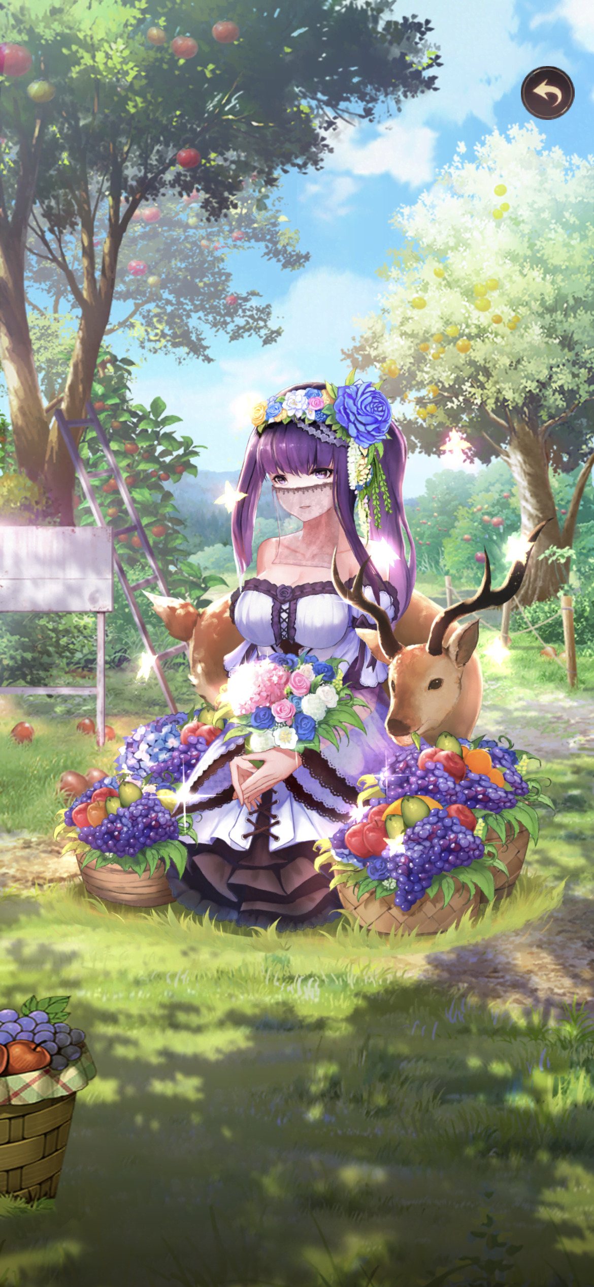 果物狩り人々の中、収穫した果物が手に入り、鮮やかな香りを味わいながら幸せそうな徐庶がいた。